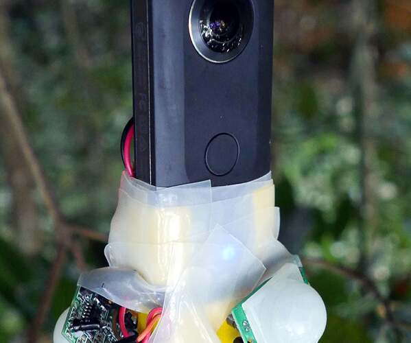 Quick summary: This is an “invasive” hack that fully opens up the case of the RICOH THETA, voiding the warranty. It rewires the buttons on the THETA and places the whole combined THETA + Arduino device outdoors with variable conditions and environment. Not for beginners.