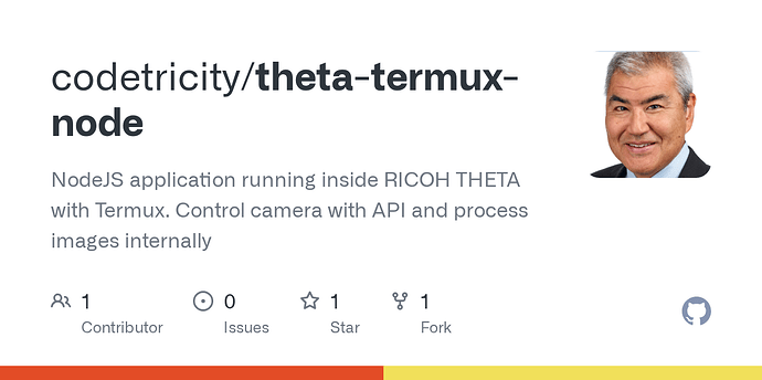 This project doesn’t start the node server automatically when the Termux plug-in starts. It’s a technology demonstration that requires you to start the node application with node index.js from the command line. You can access the Termux Linux command line inside the THETA with ssh or Vysor.