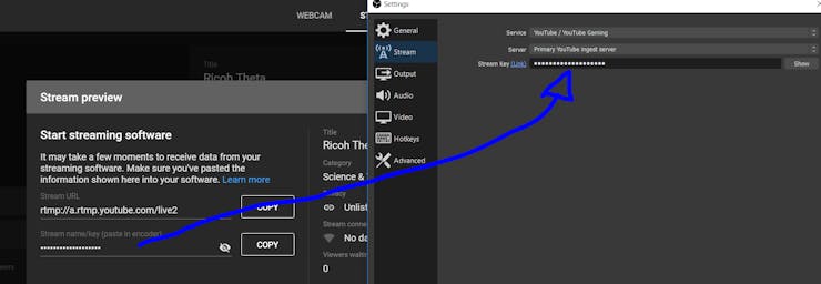 - In the “stream” tab, set the values exactly as the image and paste your key in OBS.
