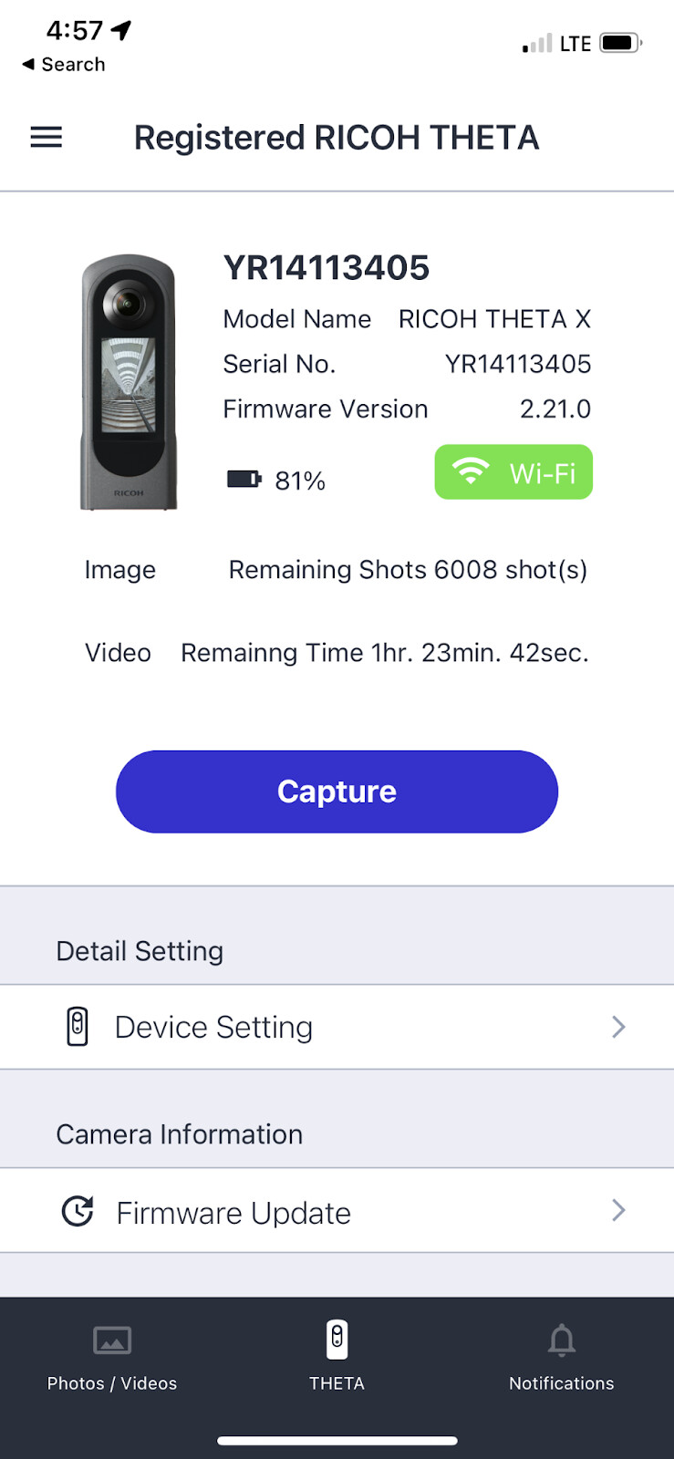 - Firmware update possible through app, appears to be the same sequence at the official RICOH THETA app (mobile update)