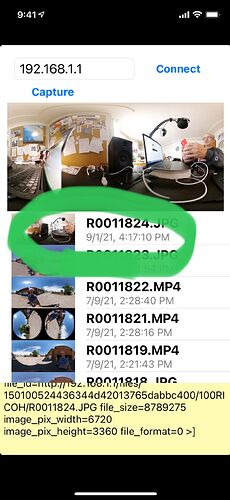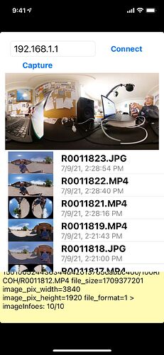 I try again. It’s connected and running. I can see a live preview. I can see a list of 360 degree images on my iPhone. Cool!