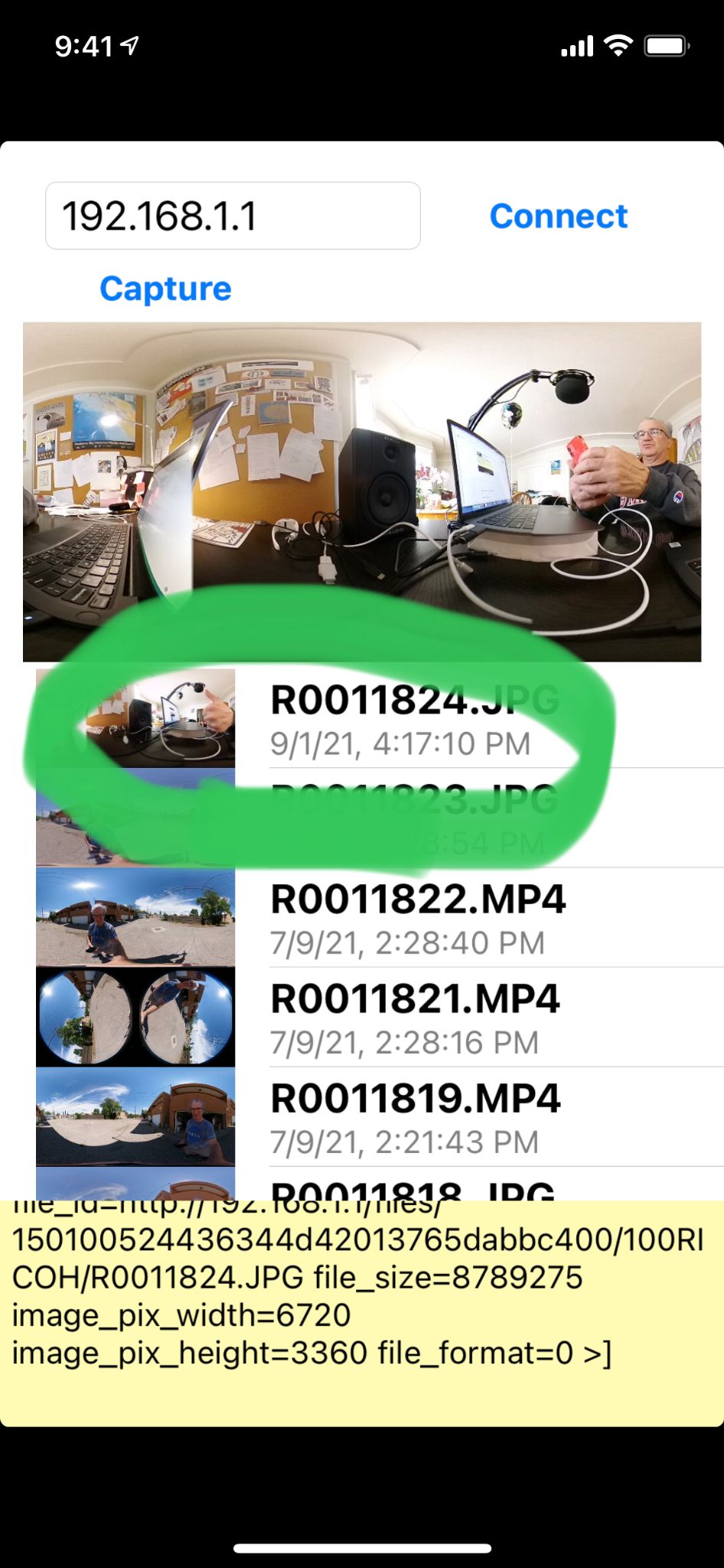 I take a test capture. I press Capture. I hear the shutter noise from the THETA. The new picture is listed.