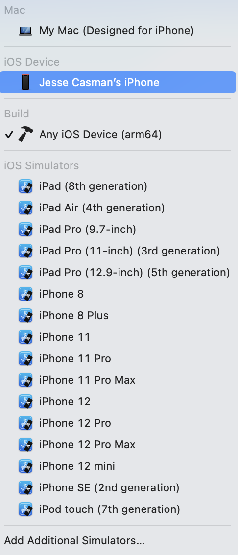 Xcode includes iOS Simulators. You may want to test on a physical device, preferably your target platform. In this screenshot I am going to build ricoh-theta-sample-for-iosv2.xcodeproj and run it on my iPhone 12.