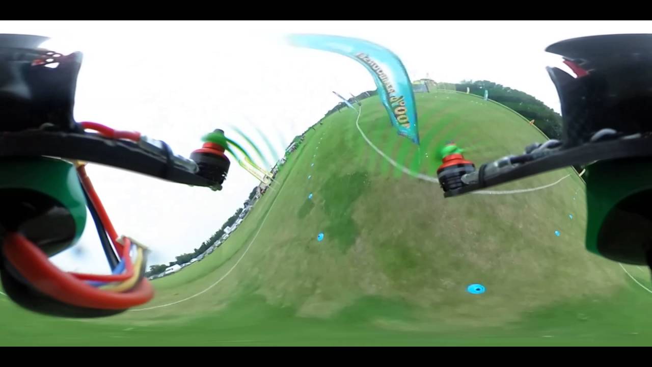 Most quadcopter first person video (FPV) feeds use a radio transmitter to send either PAL or NTSC analog video formats. The radio transmitter has a range of several kilometers and would send the dual-fisheye video feed in MPEG-4 AVC/H.264 format to a receiver.